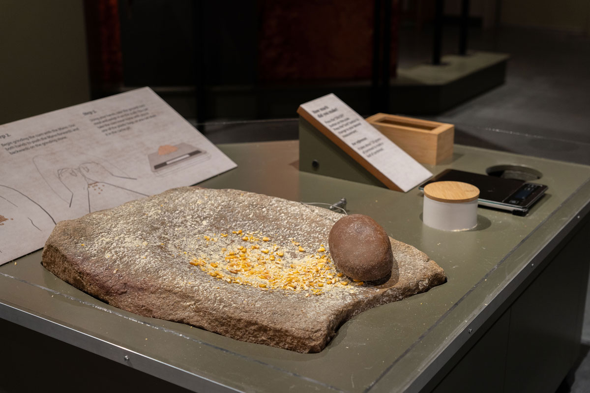 We developed a custom activity allowing visitors to grind corn using authentic tools, weigh their results, and compare quantities needed for cornbread recipes. This hands-on experience provides an intimate connection to the daily lives of the Quivira people.